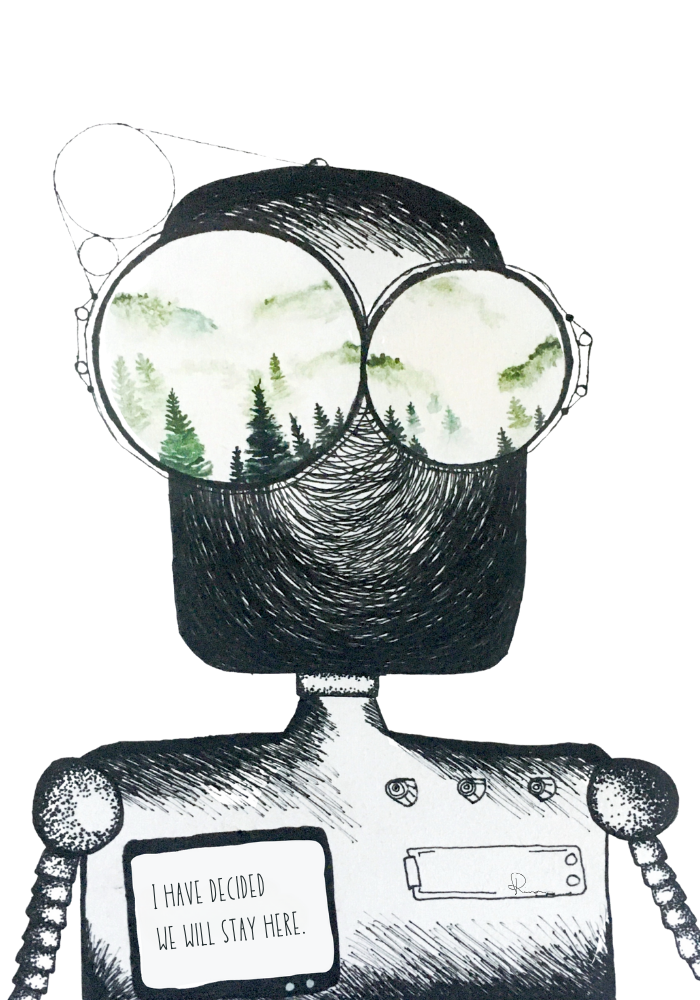 I grew up in Oregon, so the outdoors will always feel like home to me. But I also love the mechanical, the technical, and the creative mix of both. So I imagined a little robot who stumbles across a misty forest and just… decides to stay.