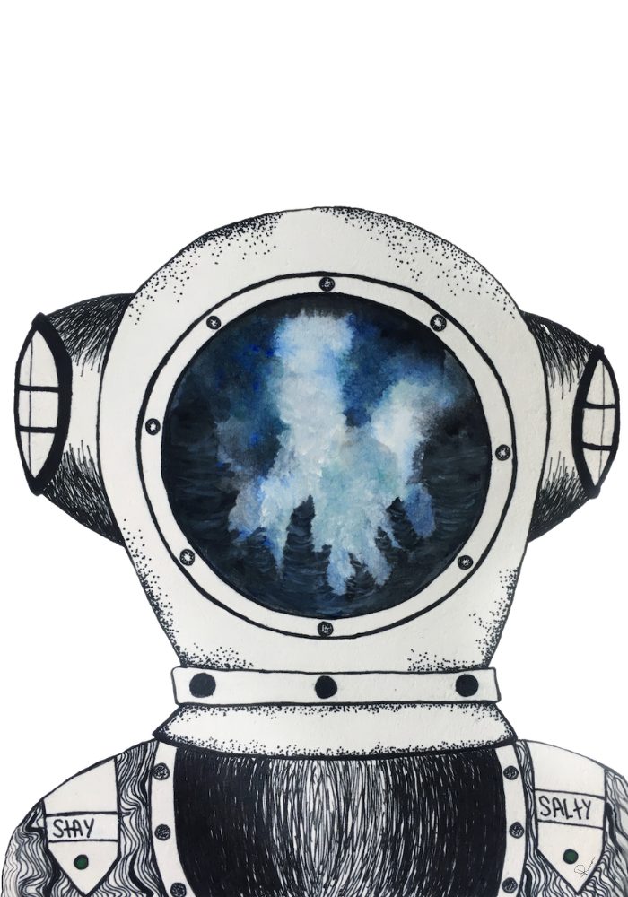 An astronaut, a deep-sea diver, and a robot walk into a bar… just kidding, they walked out of my pen. These are some of my very first drawings, when I picked up the pen during lockdown in 2020 and painted in parts with watercolor.