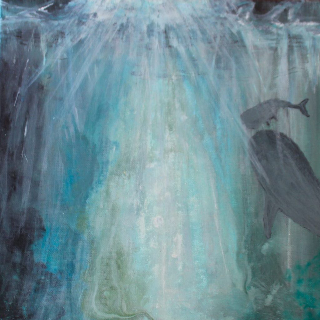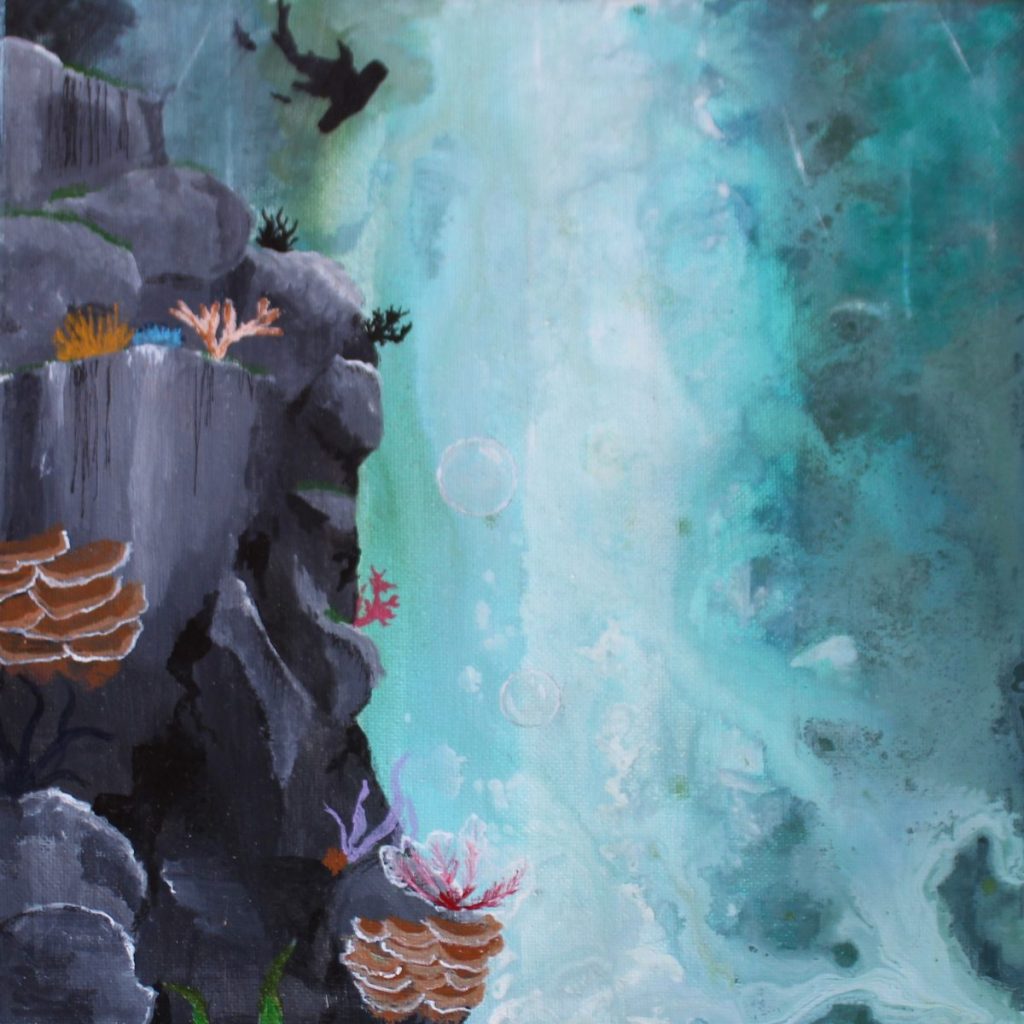 I have a memory of visiting an aquarium when I was young, and a hammerhead shark swam above my head. It was one of those moments that I remember being in love with the ocean and all the cool, weird creatures that live in it. In my painting, a shadowy hammerhead makes a cameo above the coral as a nod to the marine animals that captured my imagination