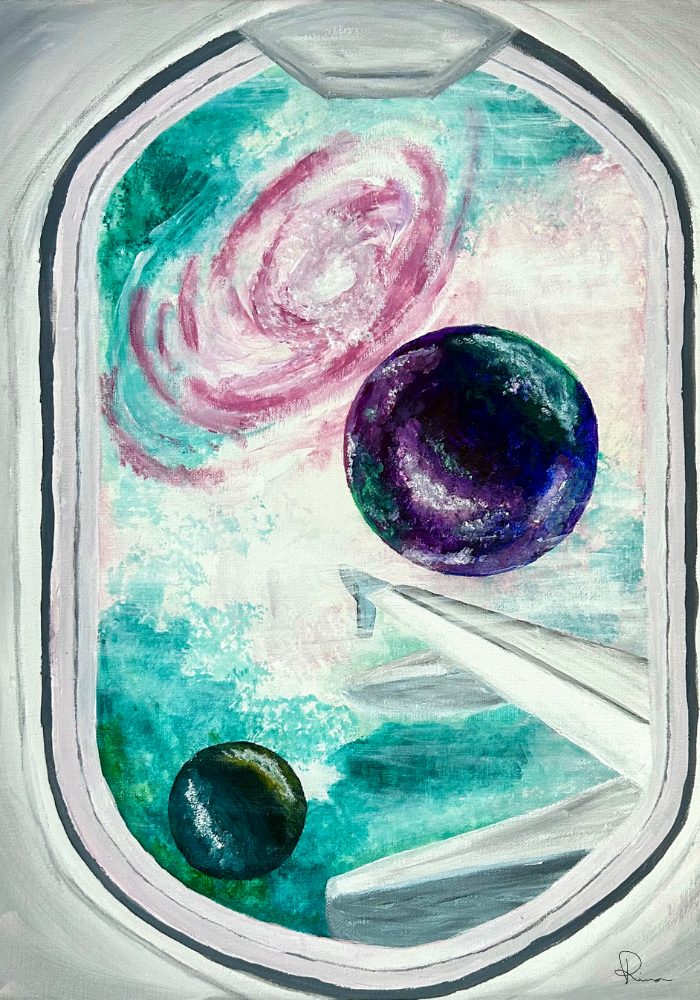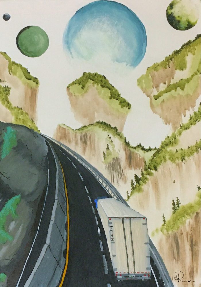 These pieces reimagine everyday travel— highways, flights, passing scenery— as if other worlds were just outside the window.